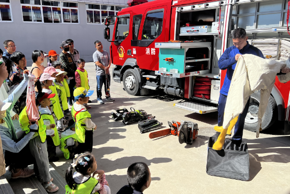 讲解的同时,消防救援人员还组织孩子们穿上防火战斗服,“零距离”体验消防装备,使他们更加深切的感受到消防员肩上的责任与使命。