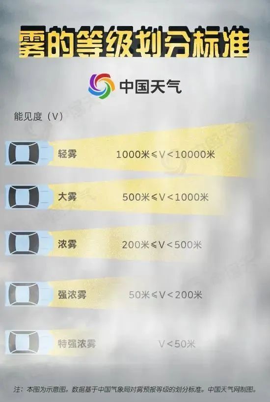 根据能见度的大小,可分为轻雾、大雾、浓雾、强浓雾和特强浓雾5个等级。