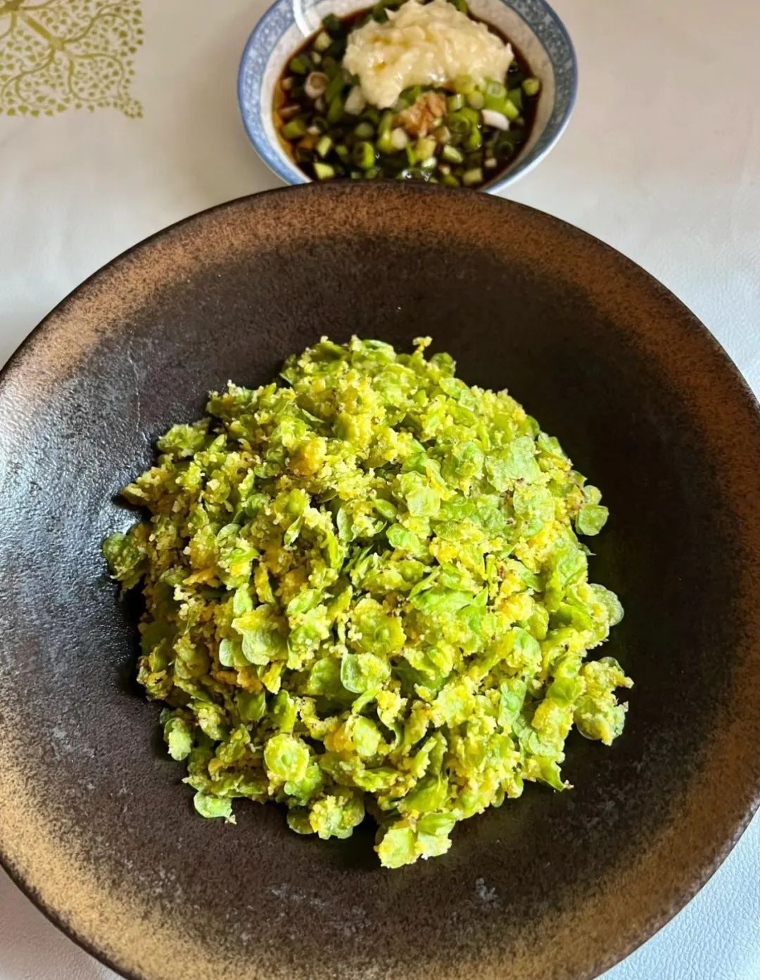榆钱是榆树的果实,圆圆如钱币、联缀成串。把榆树钱捋回家,洗干净跟玉米面混合,在蒸锅里蒸熟,就成了清香的榆钱饭。加盐、或辣椒、或葱蒜汁调味,玉米面和榆树钱都自带甜味,清甜无比。榆钱还可以和玉米面、鸡蛋调成面糊,摊在锅里煎成小饼,两面金黄、外层酥脆内里香甜。