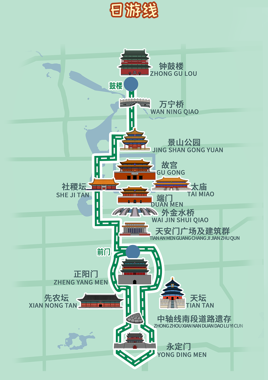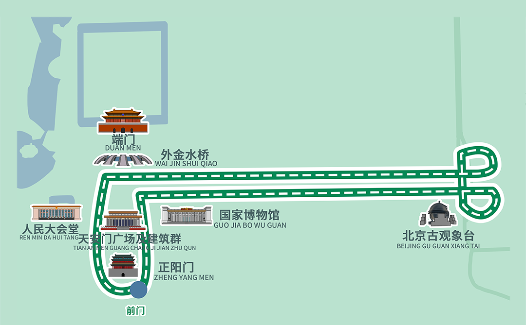 首末站前门-鼓楼,发车时间:每日10:00-17:00,线路长度12公里,中途不设站,单向运营,沿途经过正阳门、永定门、天坛、天安门广场、故宫、景山公园、万宁桥、钟鼓楼等景点,票价50元/人,包含讲解服务,车上可选购文创产品。