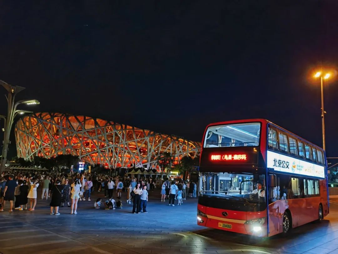 前门鸟巢水立方夜景观光巴士,采用双层观光巴士运营,首末站前门-前门,发车时间:每年5月1日至10月15日,19:00定时发车,线路长度30公里,沿途经过正阳门、北大红楼、什刹海、鸟巢、水立方、德胜门等景点,在“民族园路”(“印北京”旅游体验馆)中途站停留90分钟,票价60元/人,包含讲解服务,车上可选购文创产品。
