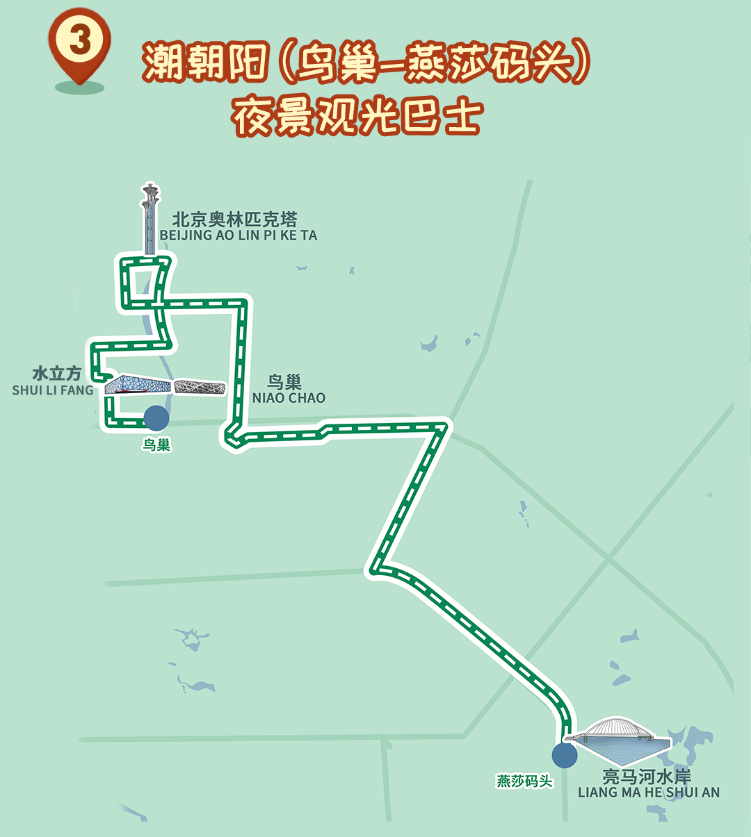 潮朝阳(鸟巢-燕莎码头)夜景观光巴士,首末站鸟巢-燕莎码头,发车时间:每年4月15日至10月15日,鸟巢:19:00定时发车,燕莎码头:20:30定时发车;线路长度17公里,中途不设站,途经鸟巢、水立方、北京奥林匹克塔和亮马河水岸等多个商圈和网红打卡地。配备车辆:新型数字双层观光巴士(豪华版),单程票价128元/人,往返票价178元/人,包含讲解服务、矿泉水、干果小食,可选购文创产品。