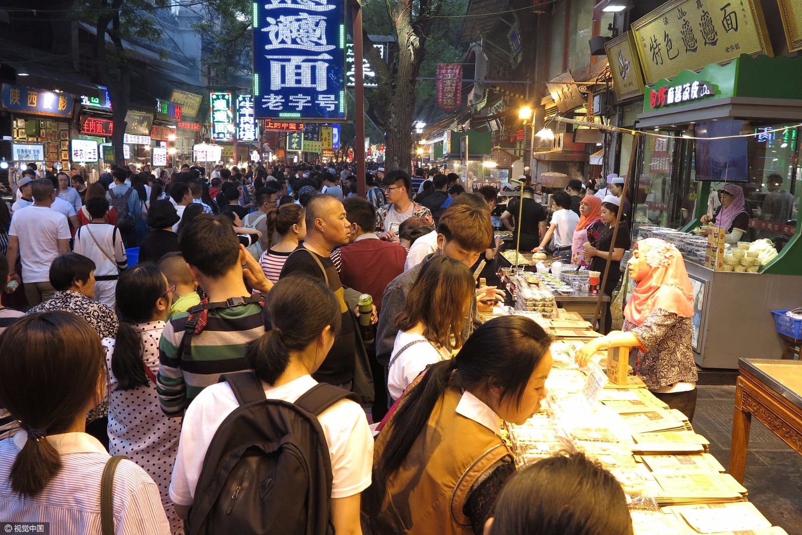 (图 西安回民街旅客开启“吃货模式”)