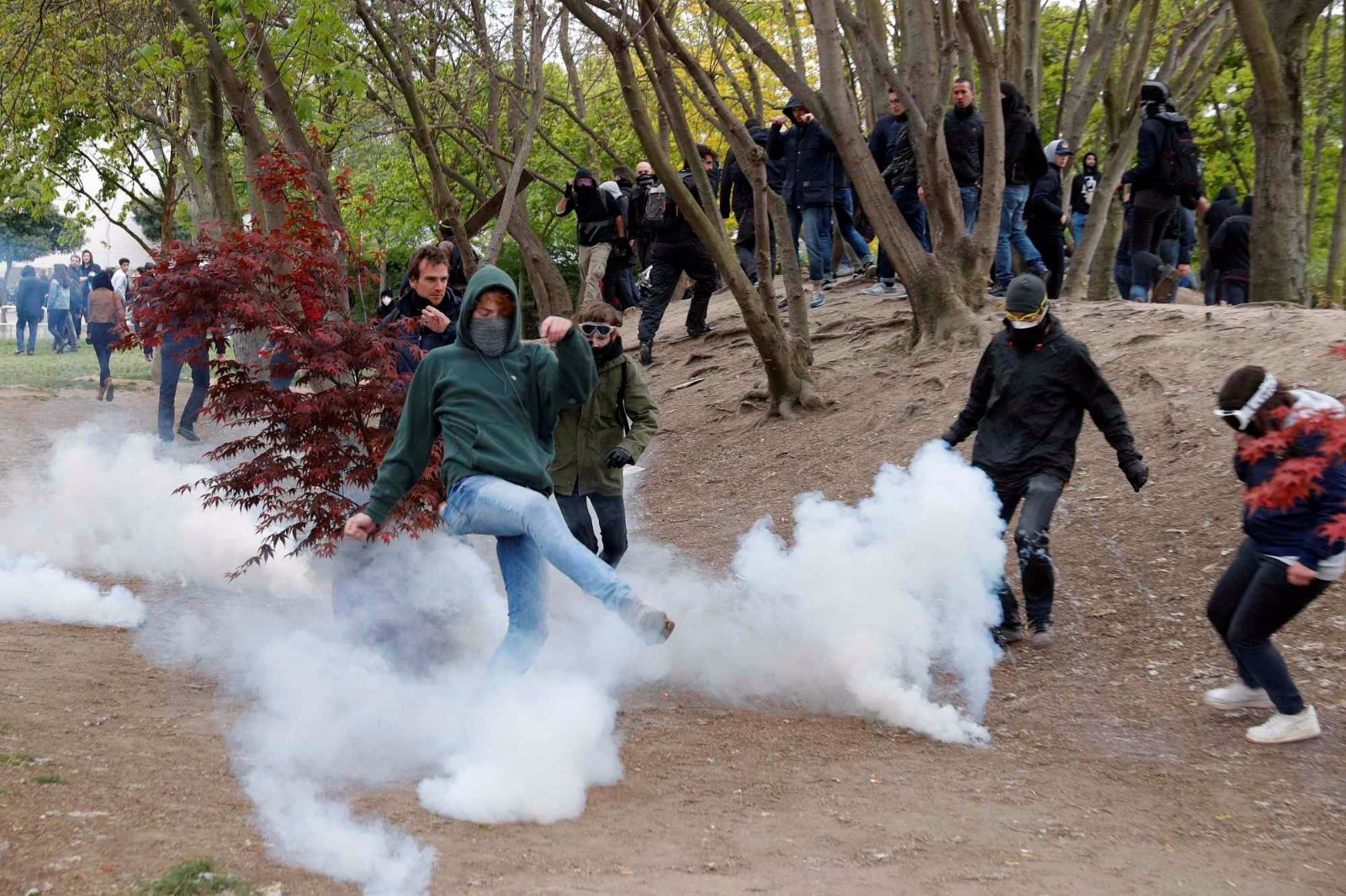 当地时间2017年4月17日,法国巴黎,法国极右翼总统候选人勒庞于巴黎召开竞选集会,民众集会抗议。