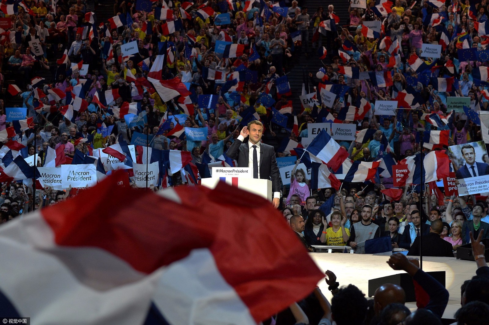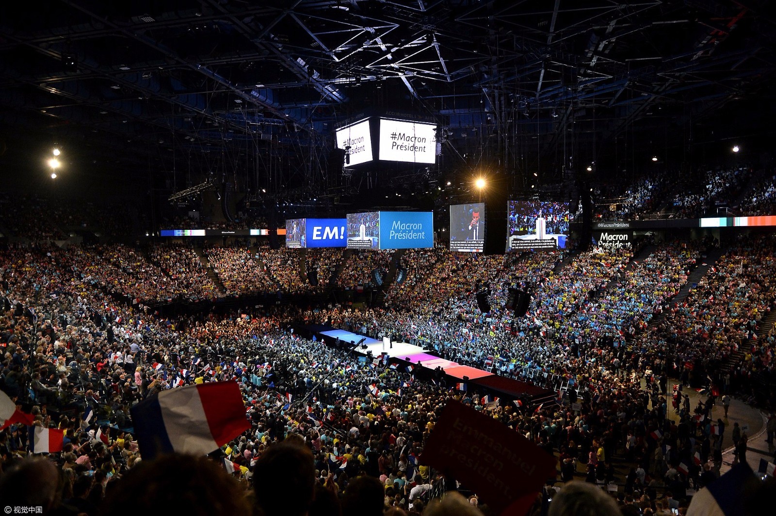 当地时间2017年4月17日,法国总统候选人马克龙在法国巴黎举行竞选集会,数以千计的支持者前来参与。