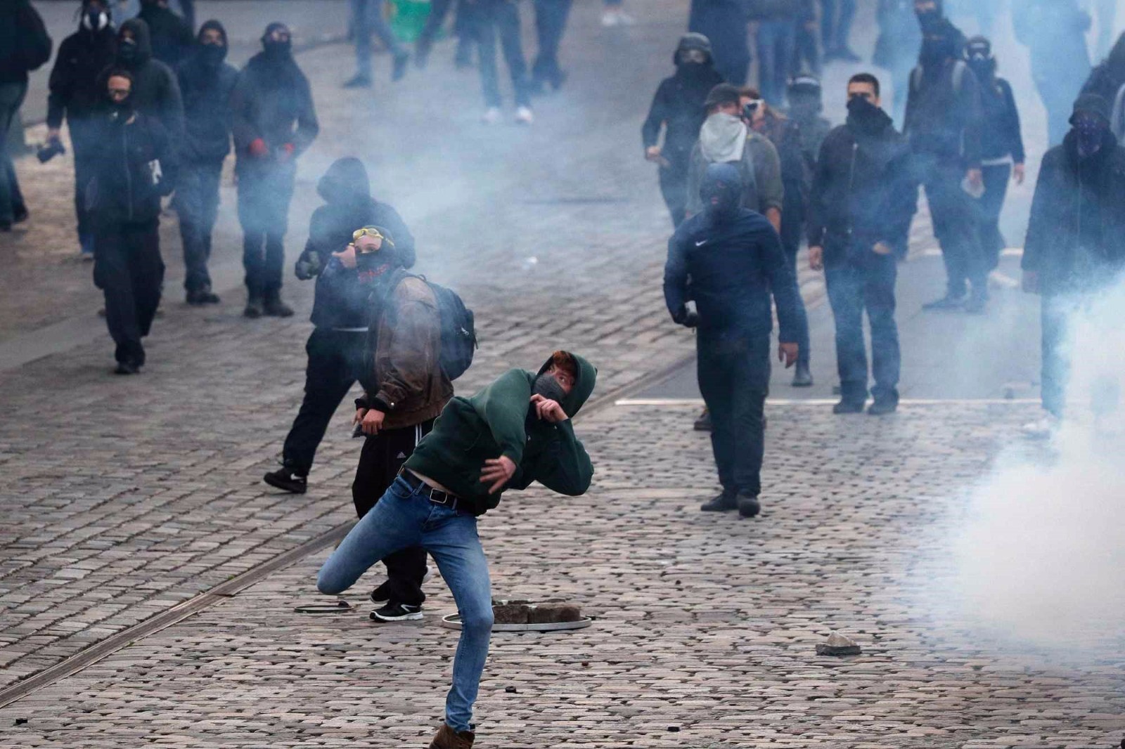 法国极右翼总统候选人勒庞召开竞选集会,遭民众场外扔石头抗议。