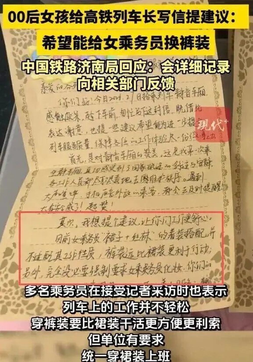 00后女孩写信建议“女乘务员换裤装”,国铁济南局客服:没有明确规定列车工作人员着裙装或裤装