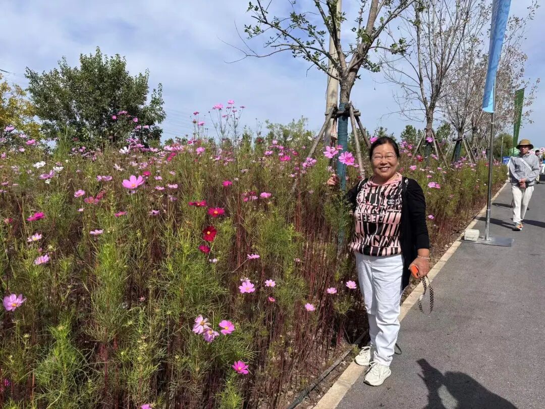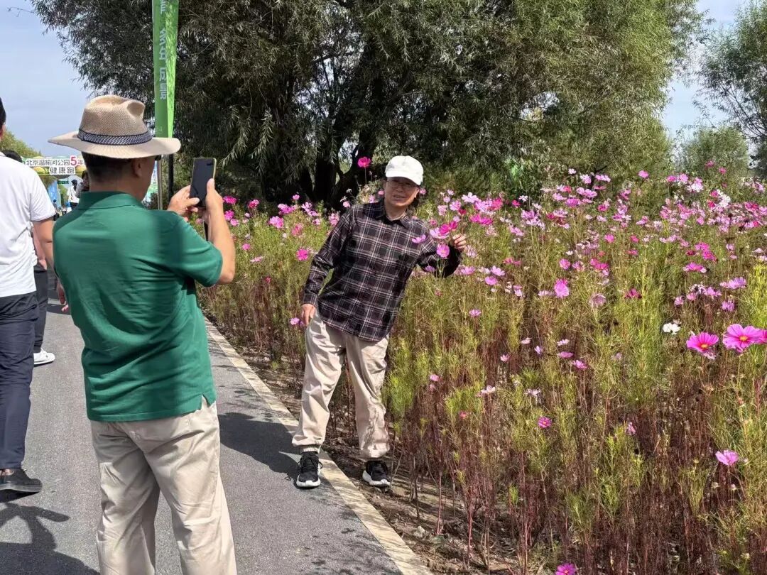走进温榆河公园,蓝天白云下,粉色的波斯菊、黄色的秋英开得正盛,蝴蝶在花丛中翩翩起舞,游客们纷纷拿起手机定格下这秋日的美景。