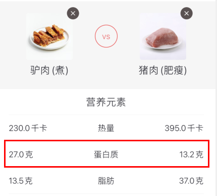 ☑ 驴肉在红肉中脂肪率很低,低热量。性温,吃多了也不会上火,怎么吃也不会发胖。