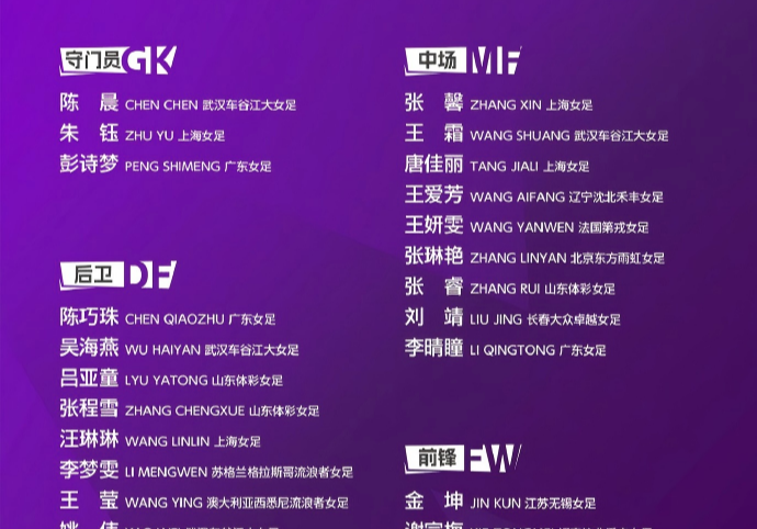 其中:王霜、吴海燕领衔,张琳艳、唐佳丽在列,吴澄舒、李梦雯、王妍雯等留洋球员入选。