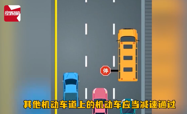 二、校车在同方向有两条以上机动车道的道路上停靠时,校车停靠车道后方和相邻机动车道上的机动车应当停车等待,其他机动车道上的机动车应当减速通过。