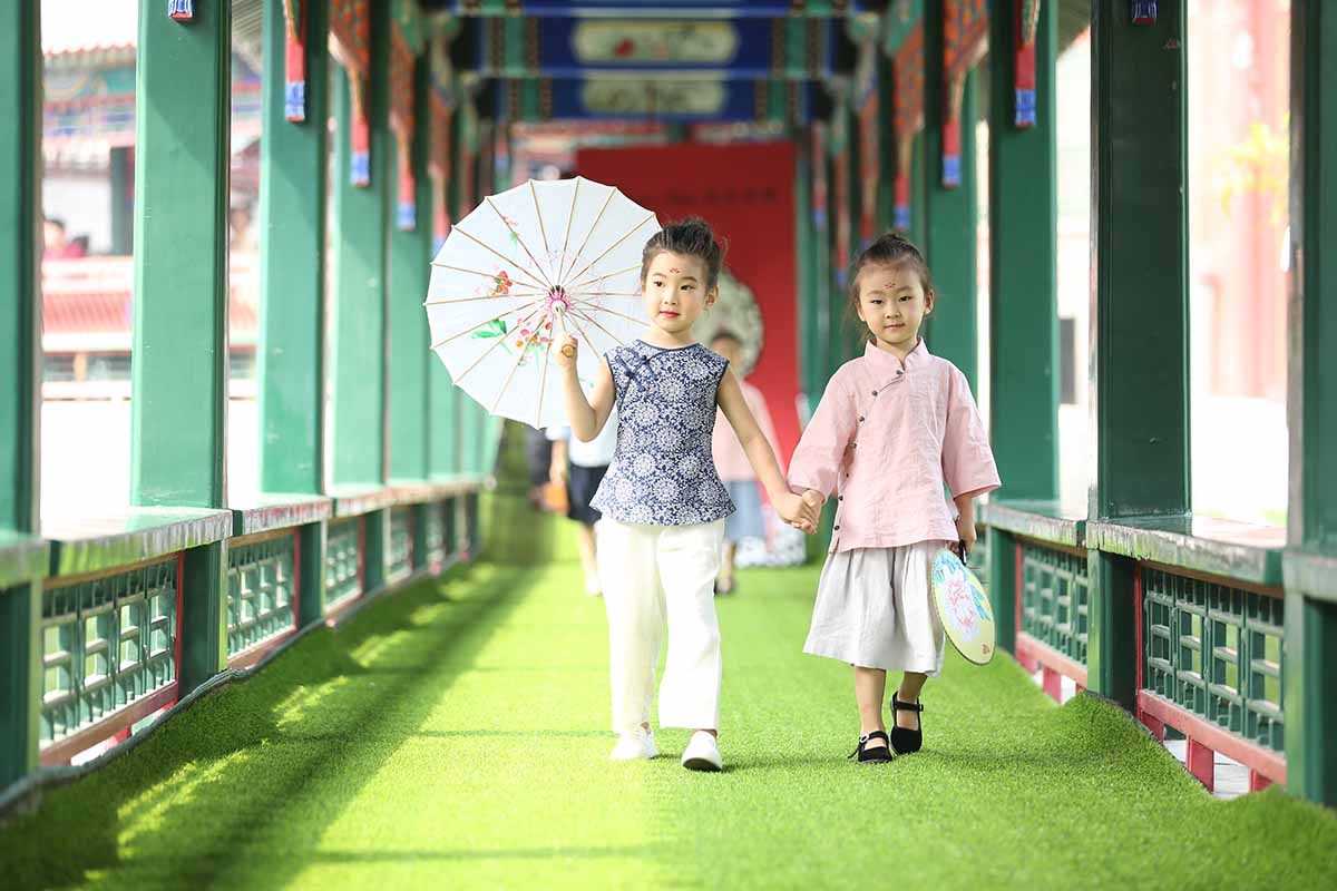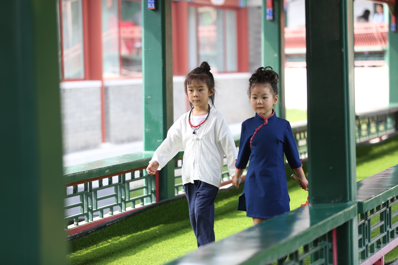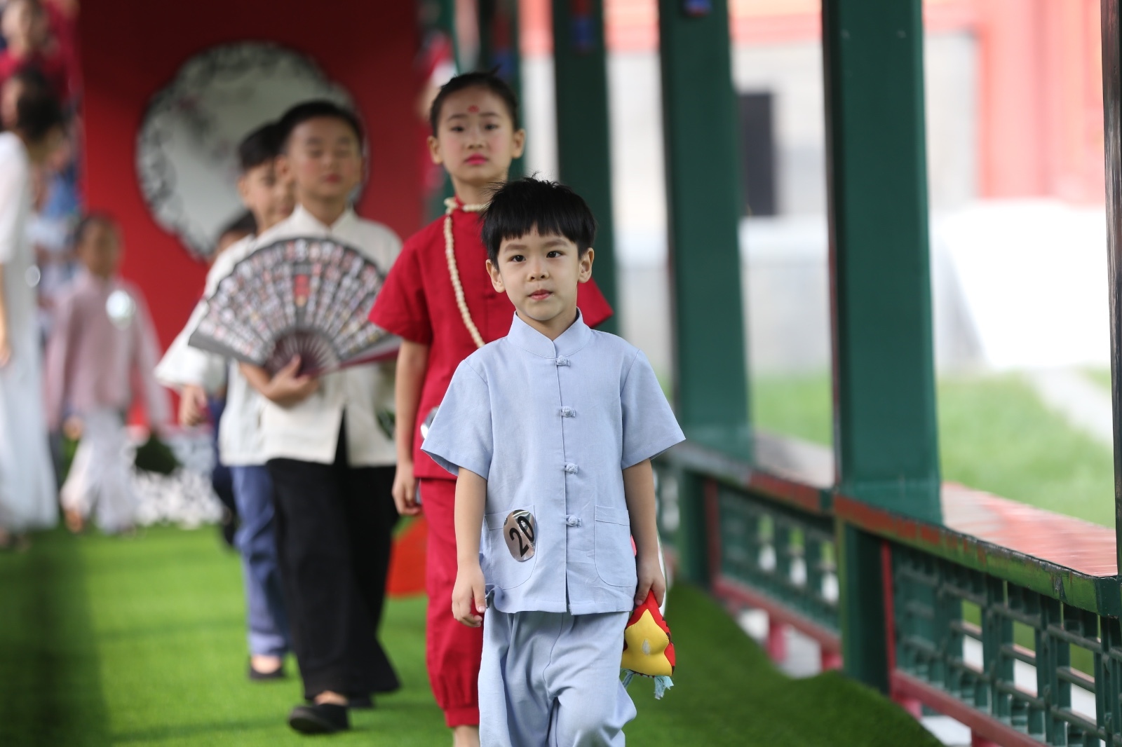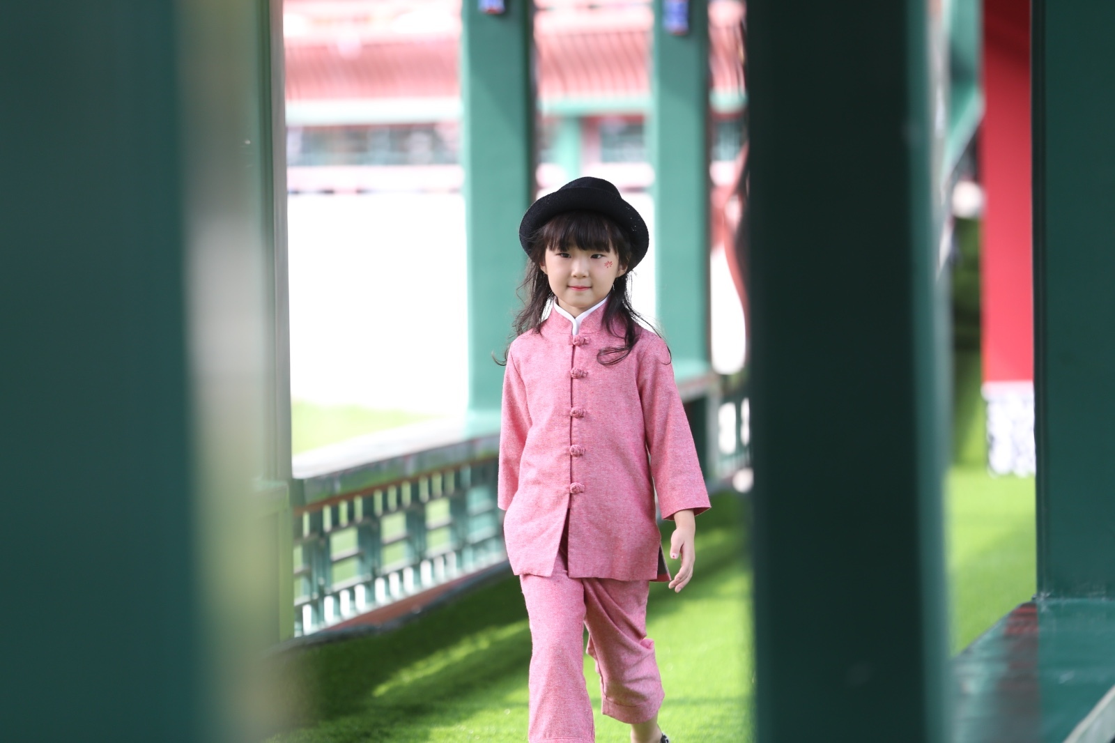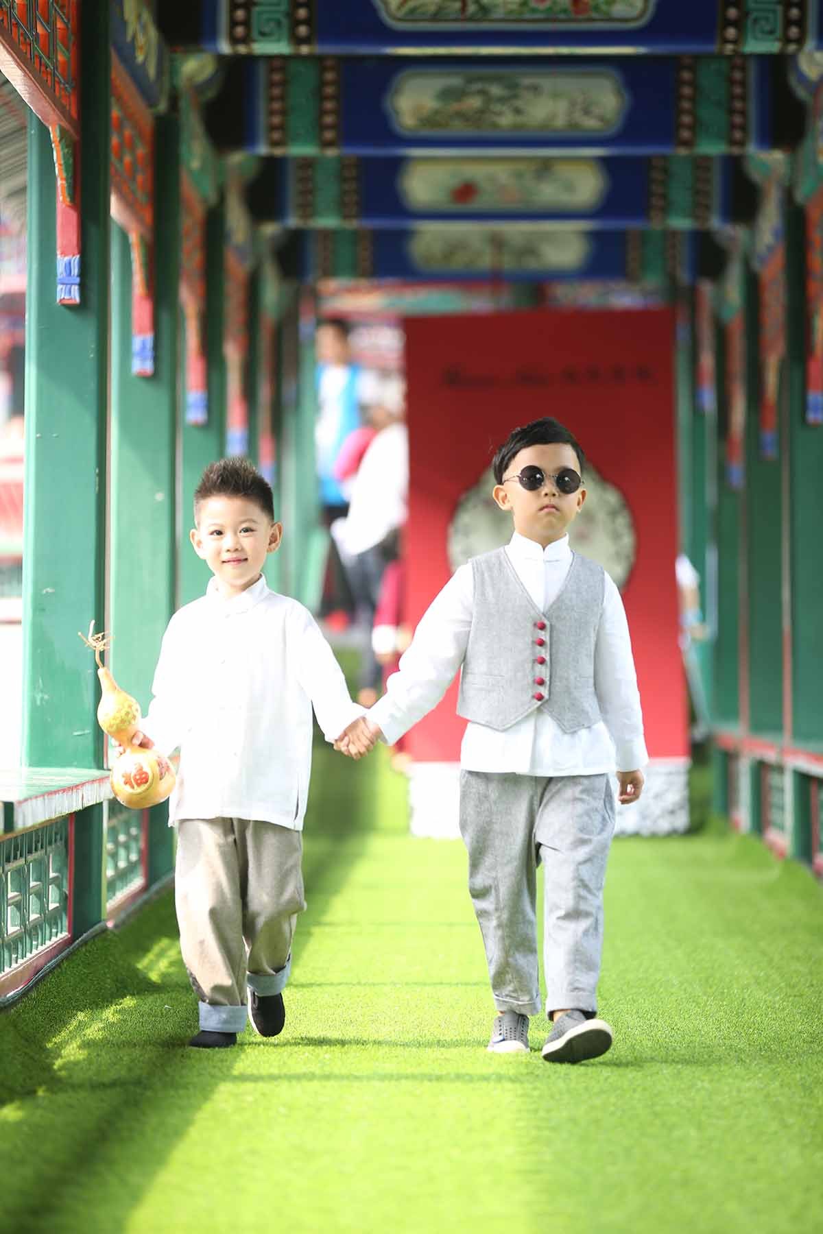 小童模们走在中式回廊里,脚踏悠悠青草返璞归真,每一位迎面而来的宝贝都如同一副画作,此时国粹与时尚进行了完美的融合。