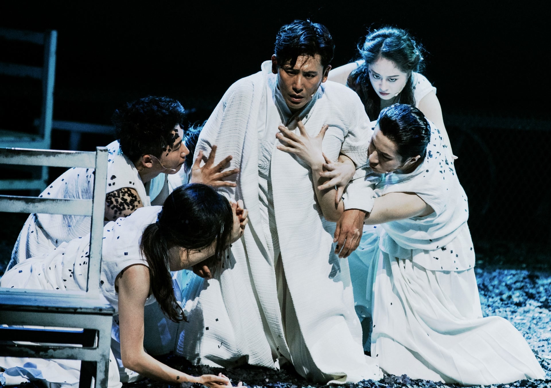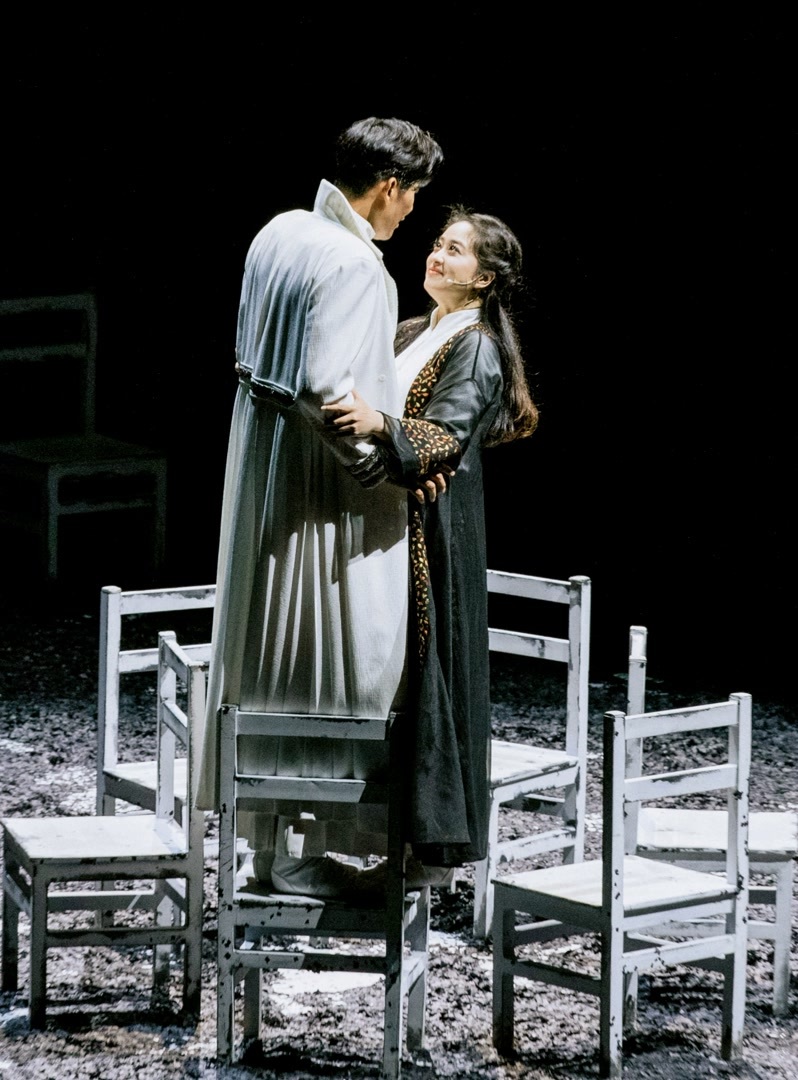 与跨越几十载的故事情节、充满思辨意味的主旨相匹配,《戎夷之衣》的舞台设计极简写意,遍布隐喻,比如对比分明的黑白两色,恰似欲望与道义、现实与理想的激烈对抗,起初全身纯白的石辛逐渐被黑色浸染,最终被滚滚而下的“黑雪”吞没;数把椅子灵活拖行于全场,它们是权位的缩影,可以象征国家的覆灭,也可以点明石辛与淳于家那建立在“椅子”基础上的姻亲是空中楼阁,不堪一击;秦国招降者那番近似胡说八道、甚至夹杂了《狮子王》台词的狂言,将世道之颠倒、权力之张狂表现得滑稽且辛辣。