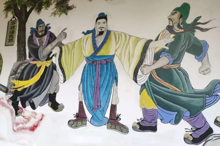 后来三人经常聚餐,张飞出肉、关羽出粮,而刘备总是空手而来,于是一次张飞和关羽就设计在井上铺芦席,想整整刘备。没想到刘备坐上去安然无恙,张飞暗暗揭开芦席一看,发现有条金龙托着刘备。明白刘备将来定会大富大贵,于是拉着关羽刘备重新祭天祭地,此为第二次结义。