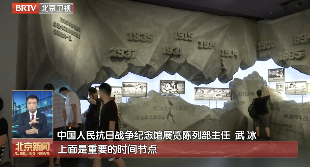 中国人民抗日战争纪念馆展览陈列部主任武冰介绍:“在日军看来,它是胜利的纪念,可是在我们中国人民看来,它就是侵占侵略中国的铁的证据。我们用了非常沉重的这种石头的装置,石头的裂缝是隐隐的光带,也就是山河破碎,中国人民被压迫,被残害。我们的主视觉,上面是重要的时间节点,日军侵华的一些重要事件的时间,主视觉的下方是日军侵华的重要事件。”