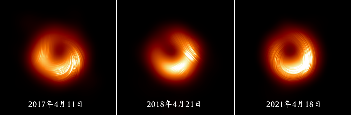 此次研究发现,2017年至2021年间,偏振方向发生翻转:2017年磁场呈一方向螺旋,2018年相对稳定,而到2021年则完全反转。这种偏振旋转方向的明显变化可能源于内部磁结构与外部效应(如法拉第屏)的共同作用。偏振的演化反映出黑洞周围的湍动不止的环境,而其中磁场在物质如何落入黑洞以及如何向外释放能量方面发挥着关键作用。