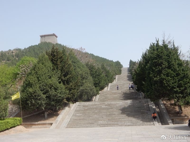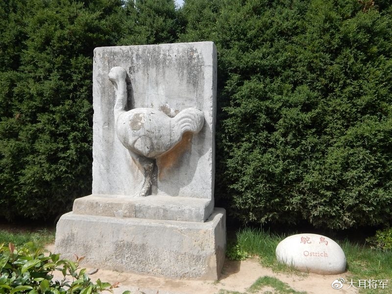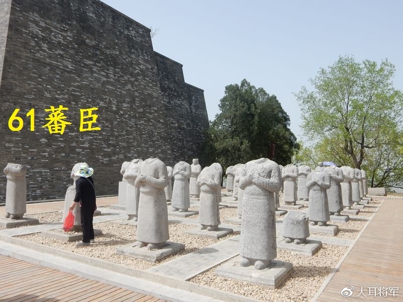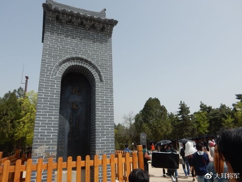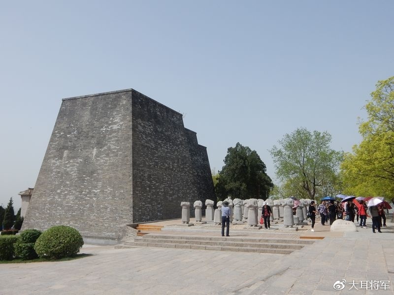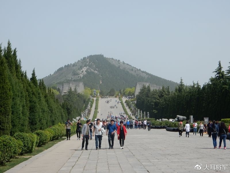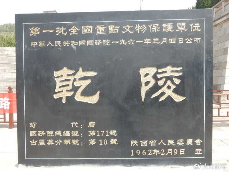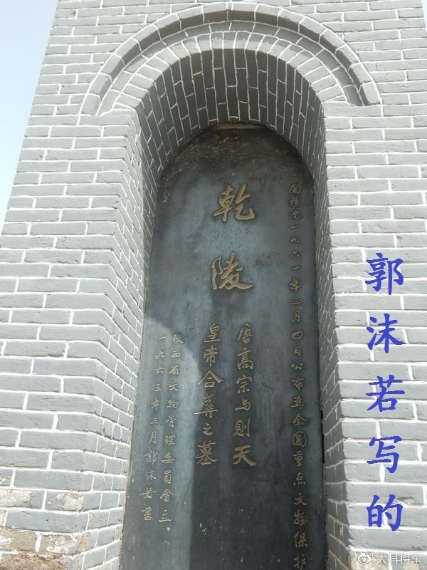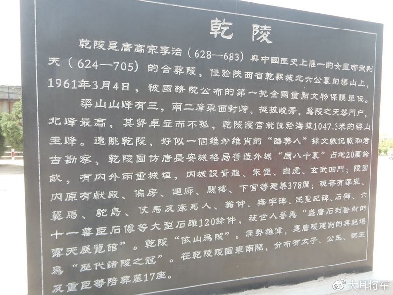 乾陵气势雄伟壮观。陵区仿京师长安城建制。梁山是圆锥形石灰岩山体,共有三峰,北峰最高,海拔1047.9米,乾陵就在北峰之上。梁山南面两峰较低,东西对峙,中间为司马道,故而这两峰取名叫“乳峰”。据史书记载,陵墓原有内外两重城墙,四个城门,还有献殿阙楼等许多宏伟的建筑物。勘探表明:内城总面积240万平方米。城墙四面,南有朱雀门,北有玄武门,东有青龙门,西有白虎门。从乾陵头道门踏上石阶路,计537级台阶,其台阶高差为81.68米。走完台阶即是一条平宽的道路直到“唐高宗陵墓”碑,这条道路便是“司马道”。两旁现有华表1对,翼马、鸵鸟各1对,石马5对,翁仲10对,石碑2道。东为无字碑,西为述圣记碑。有王宾像61尊,石狮1对。“唐高宗乾陵”墓碑,高2米,是陕西巡府毕源为高宗所立,原碑已毁,现在这块碑是清乾隆年间重建的。此碑右前侧另一块墓碑,是郭沫若题写的“唐高宗李治与则天皇帝之墓”12个大字。