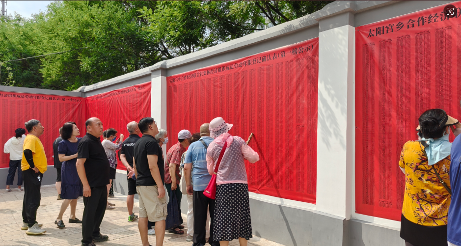 6月27日—7月3日,太阳宫乡产改办对集体经济组织成员劳龄统计进行第一榜公示。本次登记成员总人数为16280人,登记总劳动年限为252454年,人均劳动年限为15.5年。