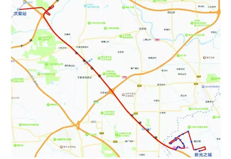 线路起自天津武清区,终点为北京通州区次渠地铁站,沿途设置16个停靠站点,在工作日、周末及节假日全天候运营。其中,工作日往返发车30班次,周末及节假日往返18班次,单程运营时长约60分钟,执行单一票制,现役军人、残疾退役军人、盲人、退休残疾警察等群体凭有效证件免费乘车。线路终点接驳地铁次渠站,可方便换乘17号线、亦庄线,实现与北京城市轨道交通网络无缝衔接,为跨区域通勤人群提供便捷高效的出行选择。