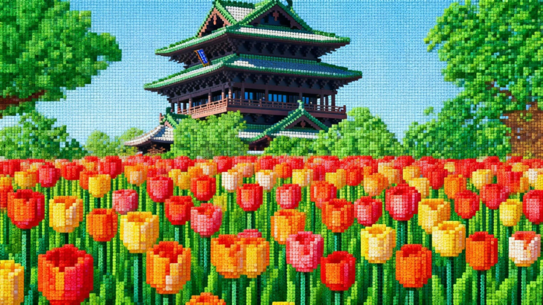 延庆的春日花海,藏在北京世园国际旅游度假区的每一寸土地上,而AI拼豆,则把这份绚烂,变成了色彩饱满的像素画卷。4月中旬,世园的郁金香次第绽放,明亮的黄、温柔的粉,一颗颗豆子拼接出大片花海,每一处都藏着春日的浪漫。