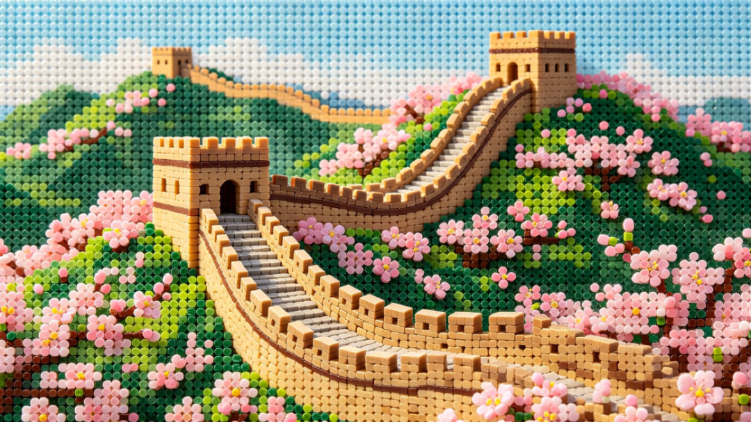 当AI拼豆遇上八达岭长城,沧桑古墙被拆解成萌萌的颗粒,漫山杏花则是温柔的粉白与淡粉,一簇簇、一片片,缀在长城的蜿蜒轮廓上,连风拂过花瓣的弧度,都被像素化定格成温柔的模样。