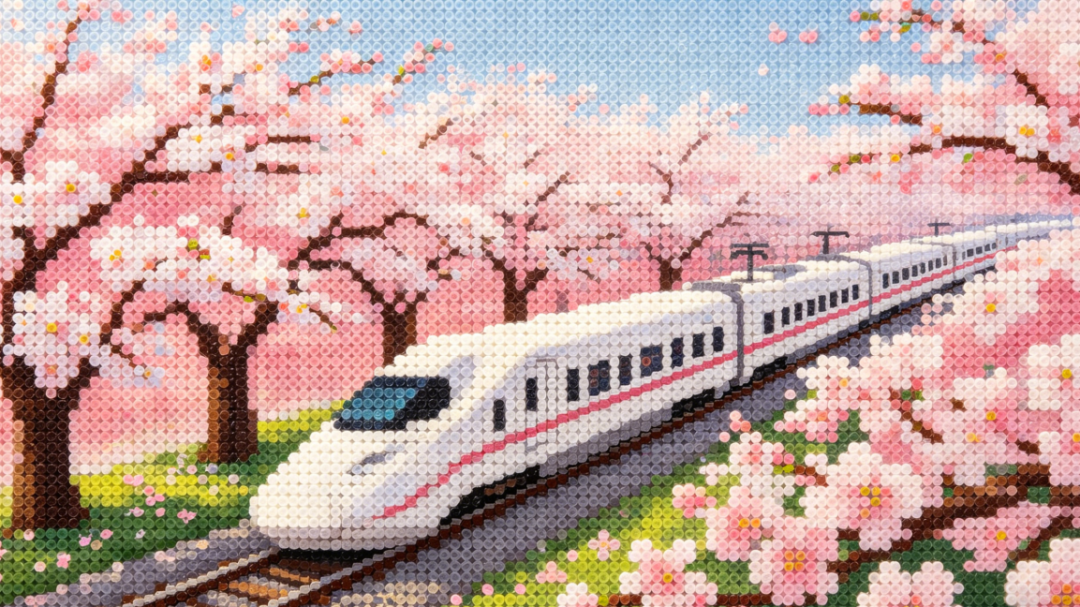 谁能拒绝一趟开往春天的列车?AI拼豆把网红S2线,拼成了最治愈的春日限定画面:白色列车是干净的米白颗粒,窗外的山桃、杏花是渐变的粉紫,远处的长城是深邃的灰,轨道旁的草木是清新的绿,每一颗豆子都藏着移动的浪漫。