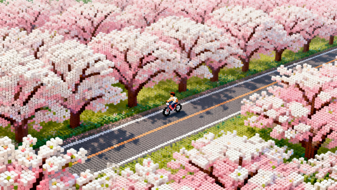 AI拼豆的古龙路,是延庆春日最灵动的流动花廊。作为北山带的观光公路,它的蜿蜒曲线被细腻勾勒,万亩杏花海则是层层叠叠的粉白、淡粉颗粒,一路山花烂漫、视野开阔,连公路旁的草木都被拼出鲜嫩的绿,落差起伏间,每一寸像素都藏着骑行与赏景的双重惬意。