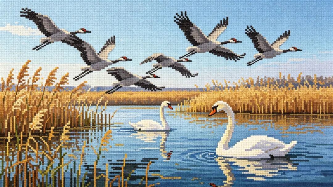春日的野鸭湖,被AI拼豆拼成了一幅灵动的生态画卷。澄澈的湖面是通透的浅蓝、青灰颗粒,岸边的芦苇荡是蓬松的米白与浅绿,最动人的莫过于那群翩飞的鸟儿——灰鹤的灰白、大天鹅的雪白,每一根羽毛的纹理都被精细还原,万鸟翔集、碧波荡漾,连芦苇随风摇曳的弧度,都被像素化得恰到好处。
