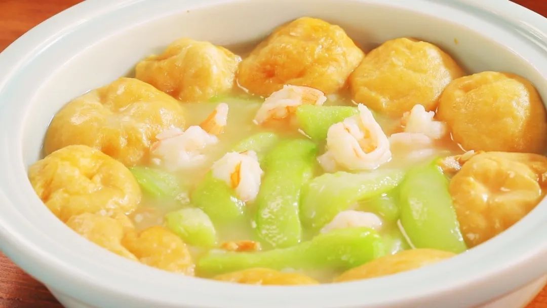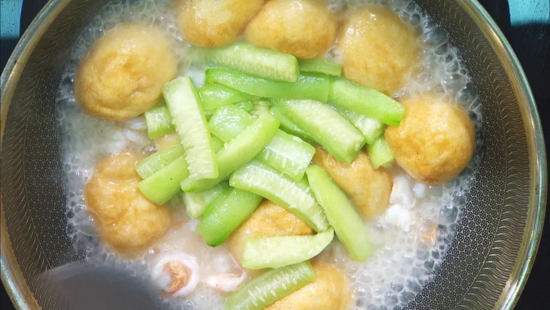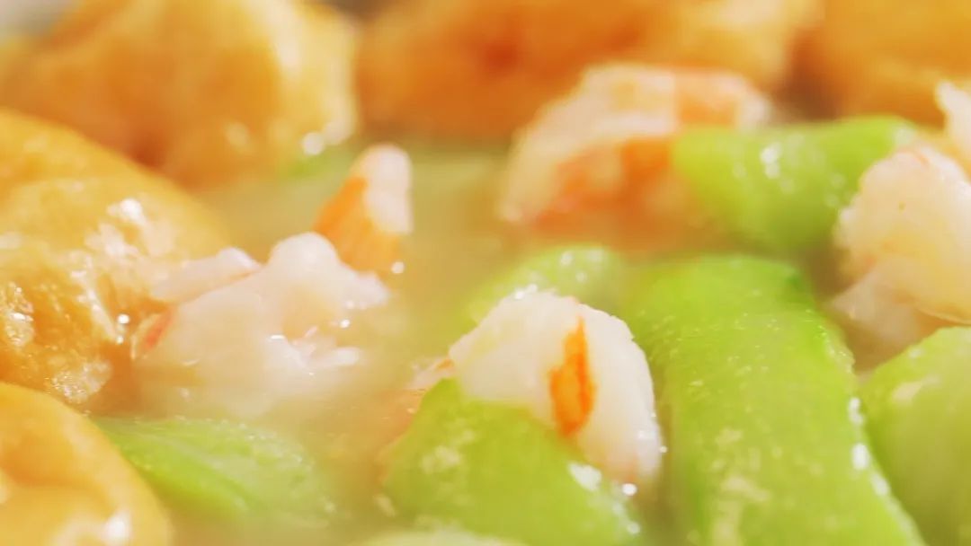 丝瓜略过一下油,然后与油面筋一同煮,将里面的油脂都煮到汤汁中,再佐以海米、虾仁这些河鲜海鲜,更加足了滋味,使得整道菜浓郁不油腻,清淡不寡淡。
