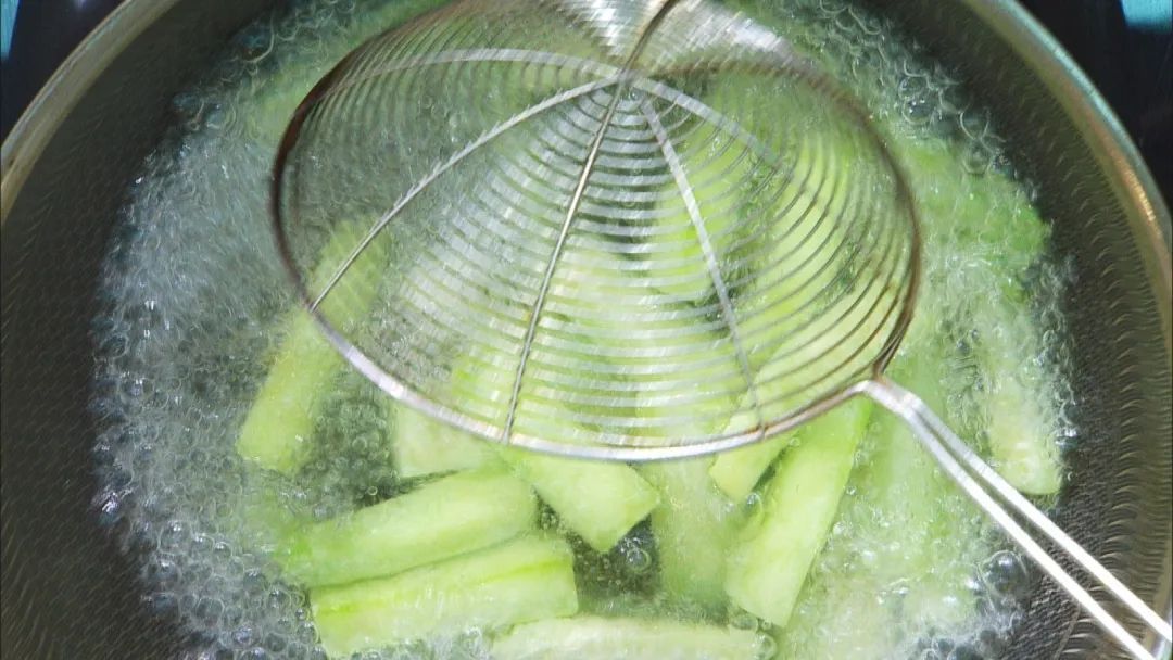 汆烫后的丝瓜捞起备用时即可放冷水中,这样既能快速冷却保持丝瓜的口感,还能杜绝丝瓜与空气中的氧气接触变黑。