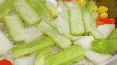 滑油汆烫:丝瓜放入5成热的油锅中大火滑油10秒钟,迅速捞出控油,然后放盐水锅中汆烫后捞出备用。