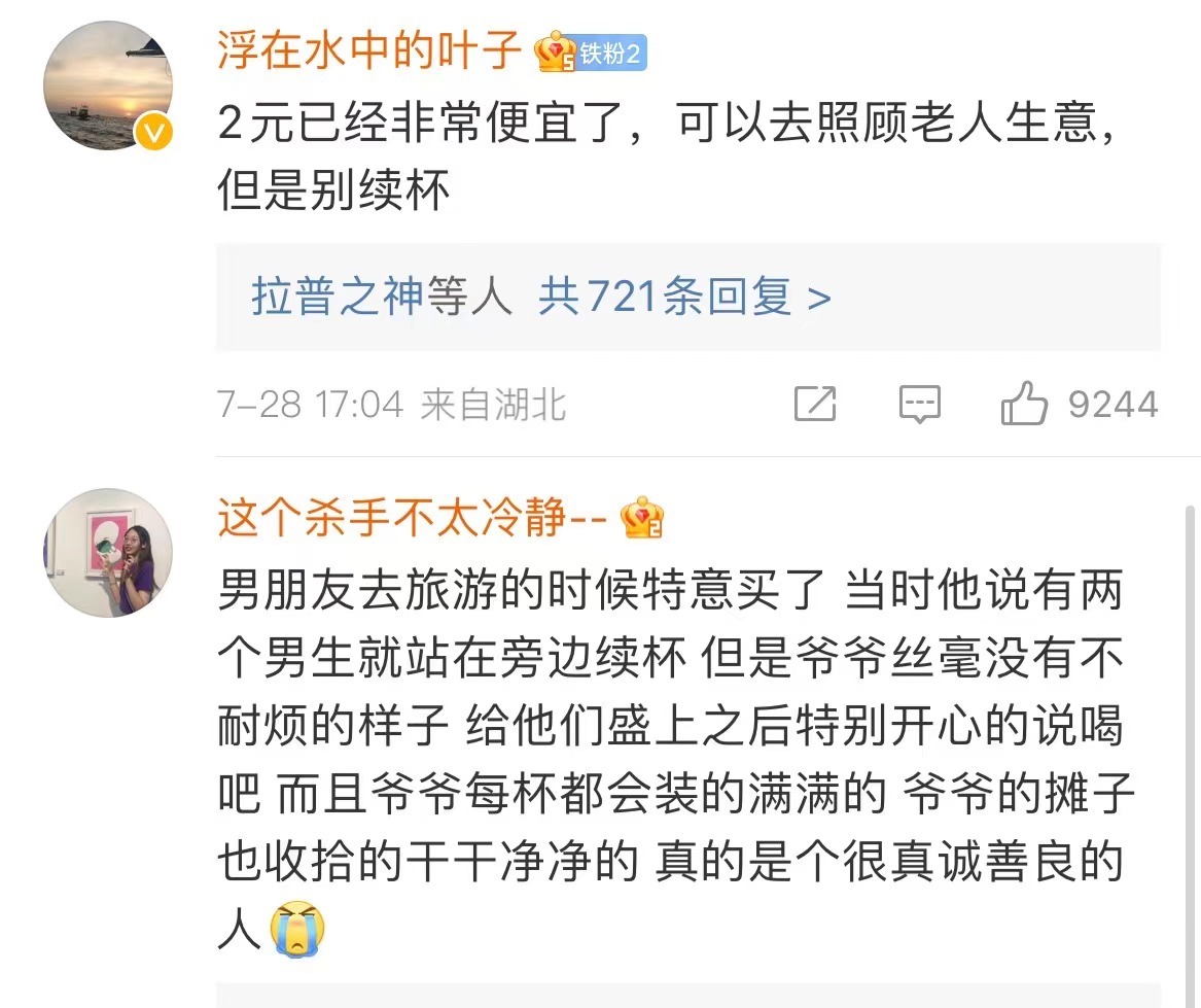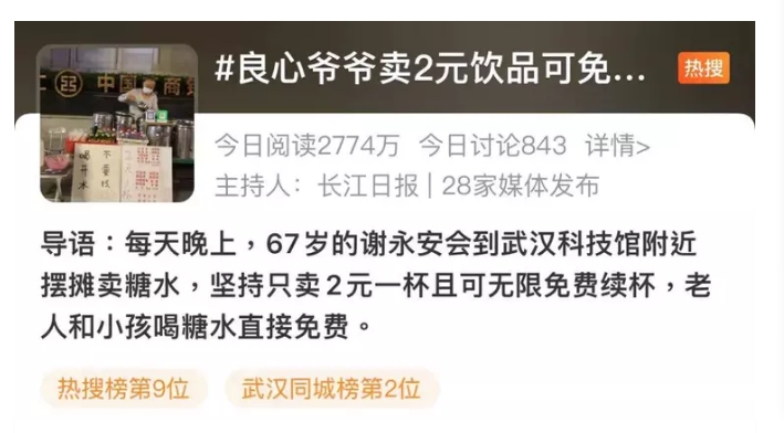 武汉良心爷爷卖2元一杯糖水还可免费续杯 冲上热搜后回应网友:坚决不涨价,大家随便喝