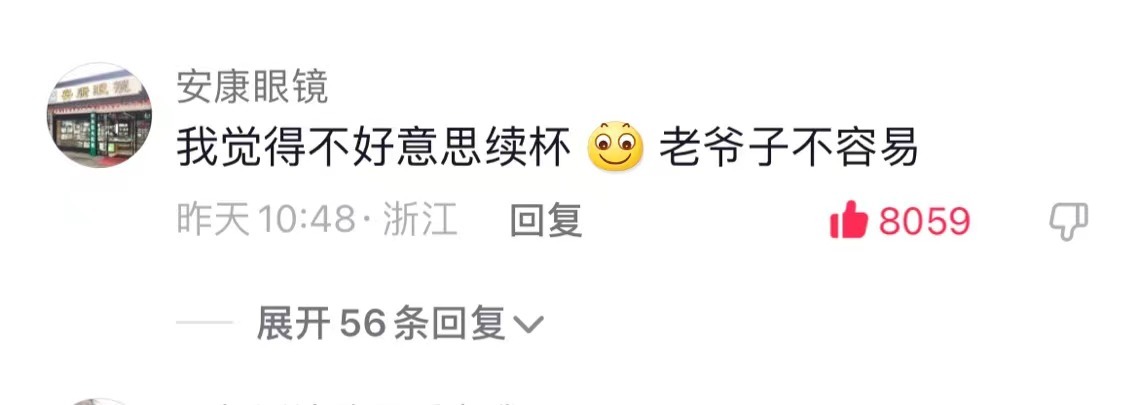 “怎么续杯的人变少了?”老谢很纳闷续杯人数怎么会锐减。记者解释:网友担心“良心爷爷”不赚钱,倡导大家放弃续杯。