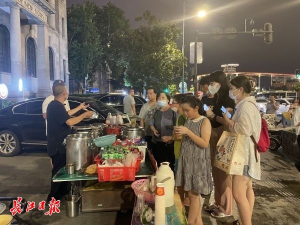 7月28日晚9时20分,记者再次来到武汉科技馆附近老谢摆摊的位置,这时已有十多人在等候。10分钟后,67岁的老谢像往常一样用平板车拖着绿豆汤、冰粉等八桶饮品赶来时,等候的顾客随即围了过去。