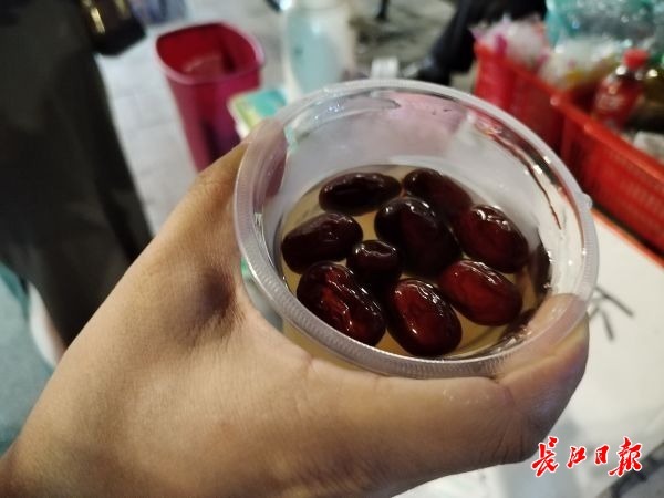 一位顾客展示“良心爷爷”老谢售卖的银耳汤里有很多红枣。 记者张维纳 摄