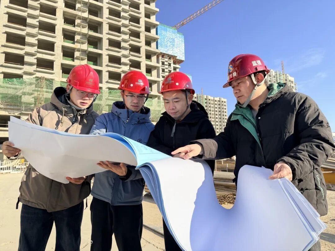 施工团队查看图纸盯进展。
