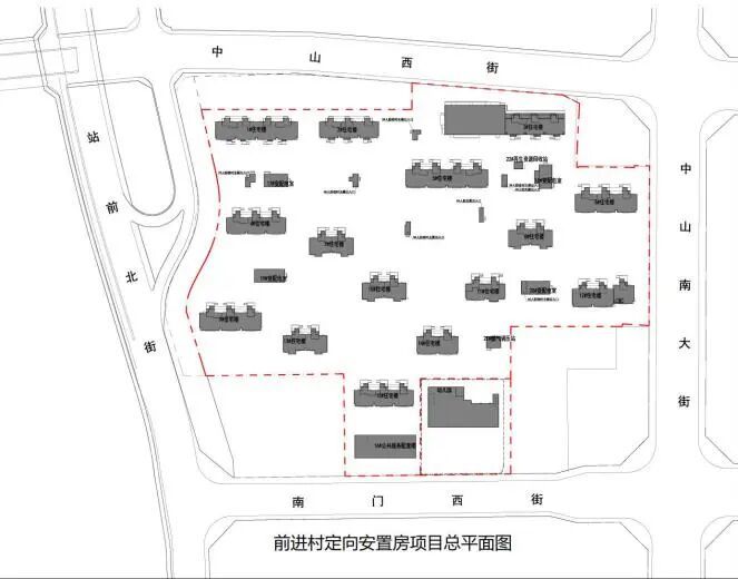 前进村回迁安置房项目分为两期建设,北至中山西街,东至中山南街,南至南门西街,西至站前北街。总建筑面积约21万平方米,规划建设用地约6.3万平方米。建设内容包括住宅楼、公共服务配套楼、幼儿园及地下车库等,共规划建设15栋住宅楼。其中,一期工程2栋住宅楼已提前封顶,提供174套安置房。