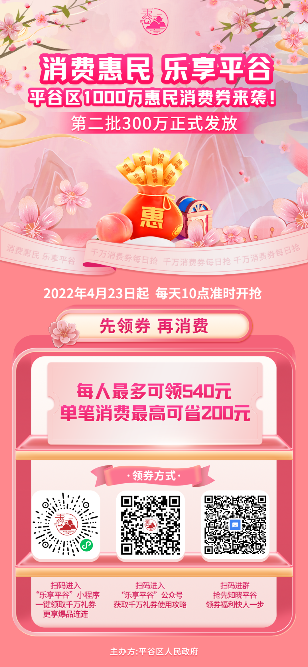 春潮涌动,福利来袭!4月23上午10时,平谷区新一轮惠民消费券正式开始发放。消费者可通过“乐享平谷”小程序参与活动,领取这份总额300万元的惠民大礼!