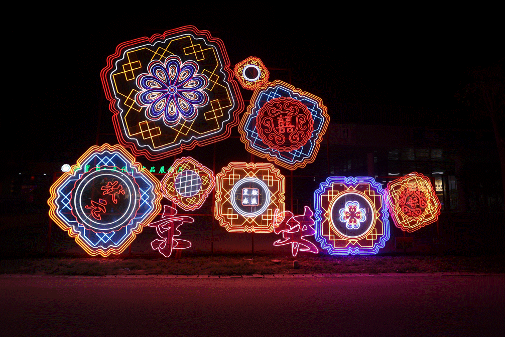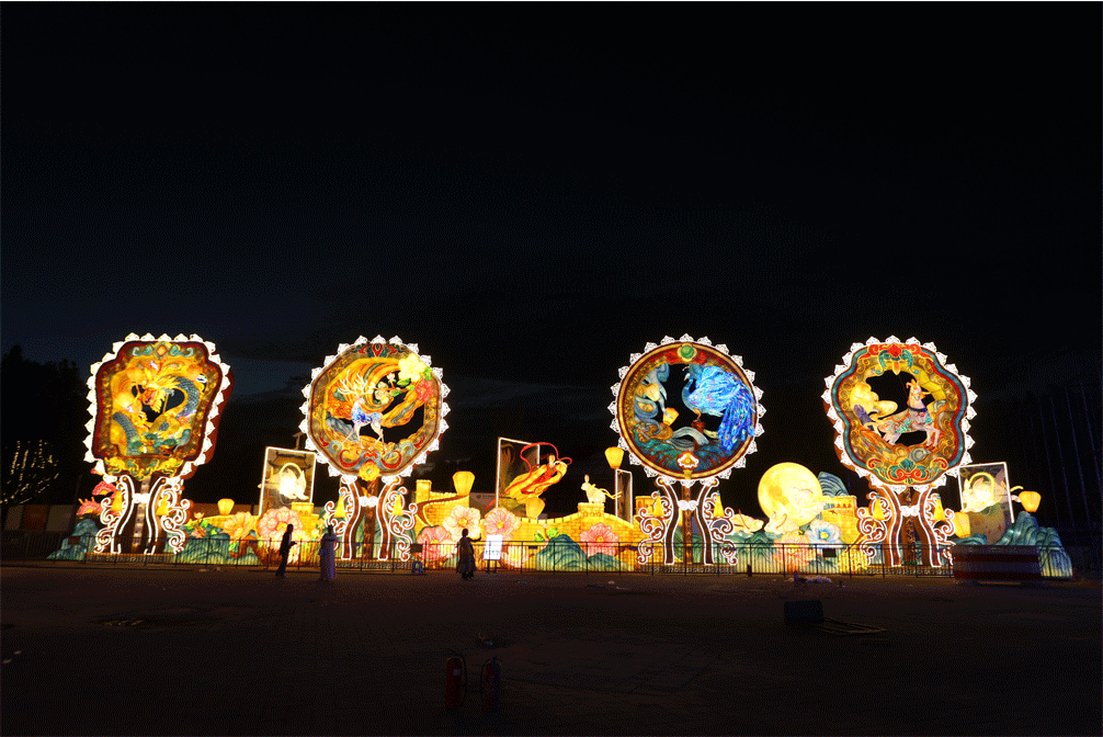 节日欢歌位于园博园3号门入口区域,这里设有迎宾门、团圆宫灯、时代画卷、花团锦簇、花好月圆、北京风物等众多超大型、大型灯组,同时也是九大主题区当中大型灯组最集中的区域。