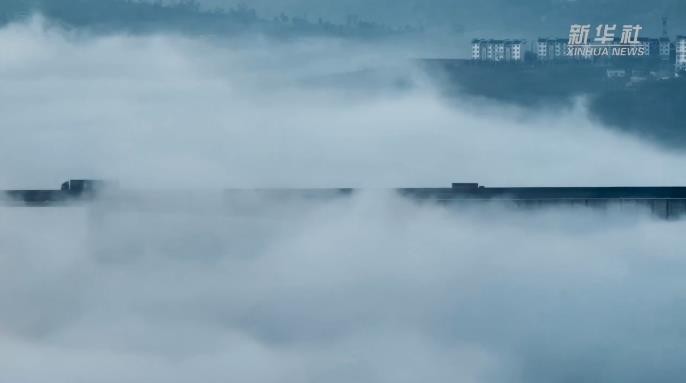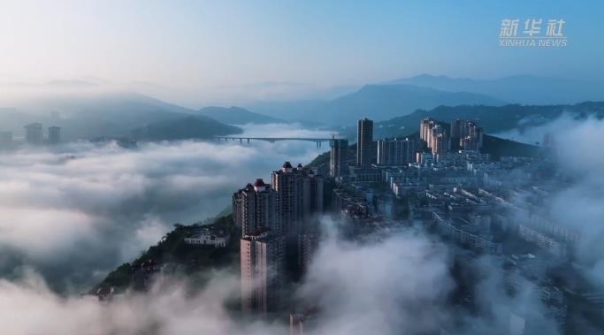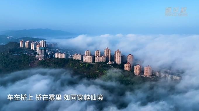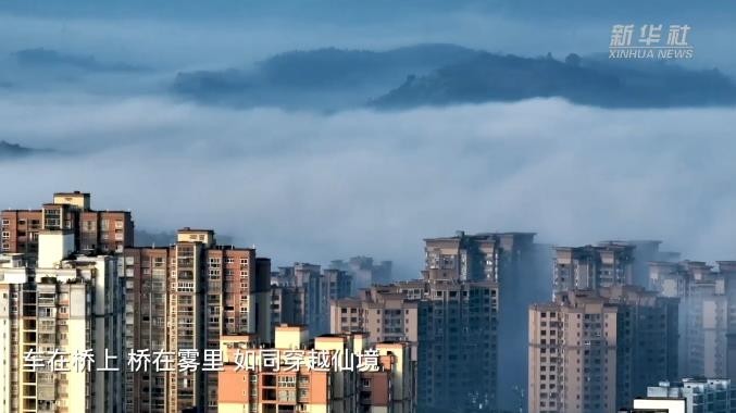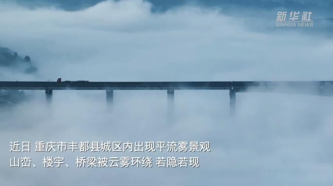 近日,重庆市丰都县城区内出现平流雾景观,山峦、楼宇、桥梁被云雾环绕,若隐若现。车在桥上,桥在雾里,如同穿越仙境。