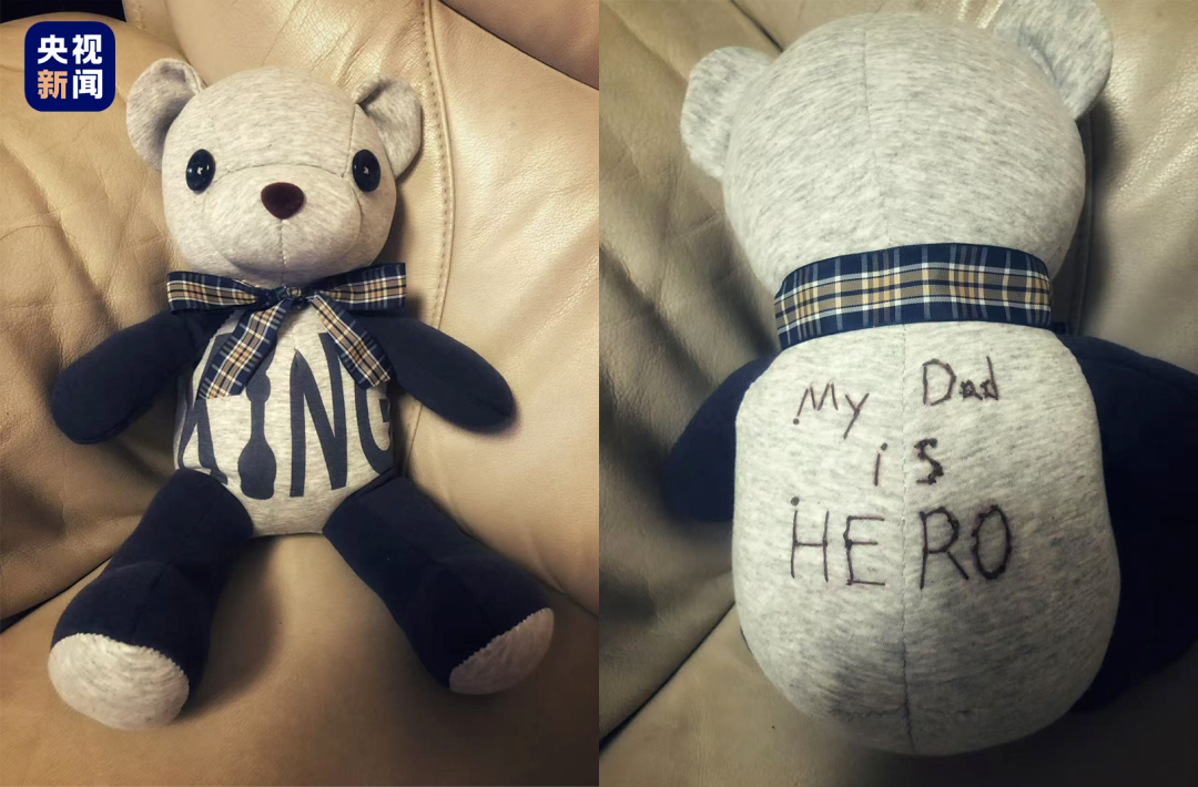 辅警的妻子寄来的这件灰色卫衣,是丈夫生前最爱穿的便装。喻洁想,这个孩子对爸爸的最初印象,或许就来自这只小熊。缝制过程中,喻洁几度落泪。为了让这只小熊更特别,她特意在熊身上缝了一句话:My dad is hero(我的爸爸是英雄)。