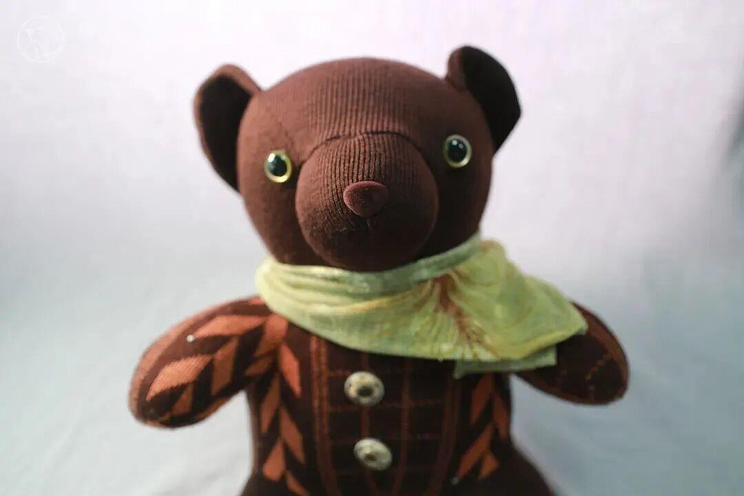△这只“爸爸熊”蓝灰相间,穿着那件灰色卫衣改的外套,胸前保留了原来的纹路。