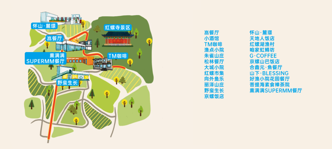 红螺美食线路位于红螺寺景区南部,总长2.2公里,集登山休闲、游览景区、遍尝美食体验于一体。线路以朱雀山庄为起点、天地人饭店为终点,其中包括熏满满、野蛮生长、怀山 · 麓璟、嵓、T&M咖啡、菩提海素斋等特色餐厅、咖啡,穿插各类精致雅趣民宿。