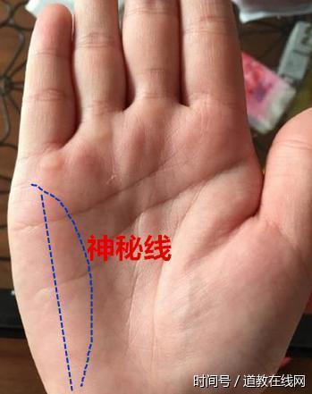 从水星丘穿过深长的感情线,往下延伸到月丘的竖直线,或者圆弧线,都是神秘线。有神秘线的人,极具想象力,好奇心极强,对神秘的文化充满兴趣,其卓越的洞察力,往往能发现深藏的宝物,或者别人内心的想法,要么得到宝物而发财,要么因洞察人心而富贵