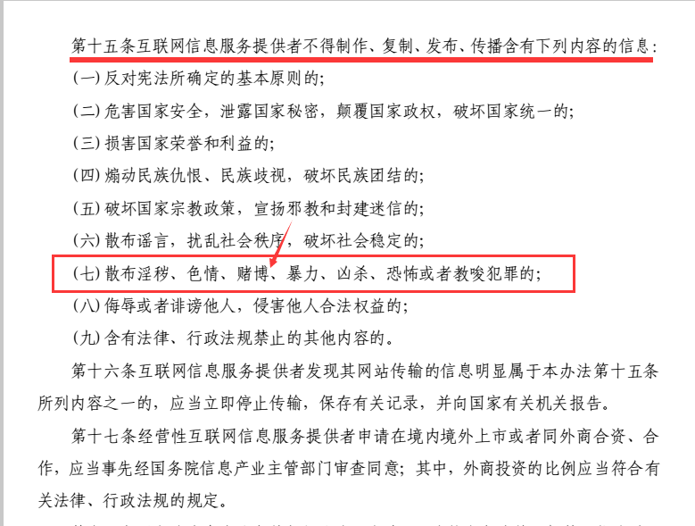 根据国家互联网信息办公室室务会议审议通过的《互联网信息服务管理办法》第十五条之规定:互联网信息服务提供者不得制作、复制、发布、传播含有下列内容的信息:第(七)条:散布淫秽、色情、赌博、暴力、凶杀、恐怖或者教唆犯罪的;其中在管理办法中明确规定互联网网站提供者备案的网站是不得从事非法活动,包括赌博一项对网民造成极大损失的非法活动。