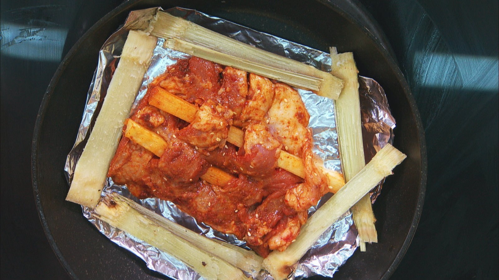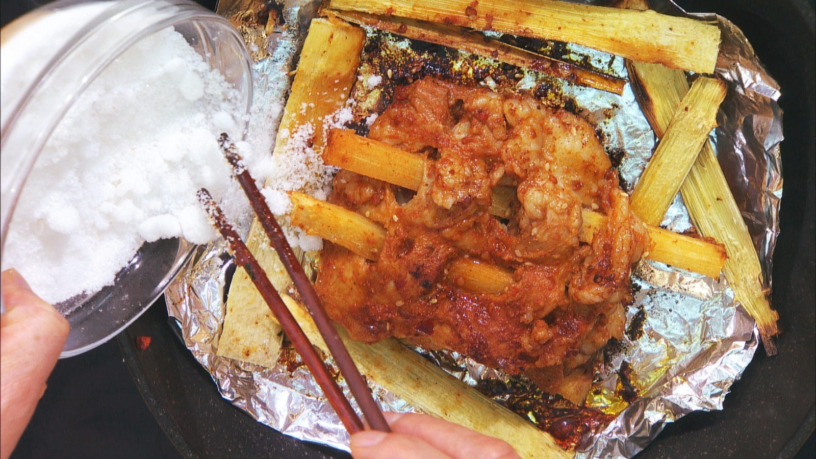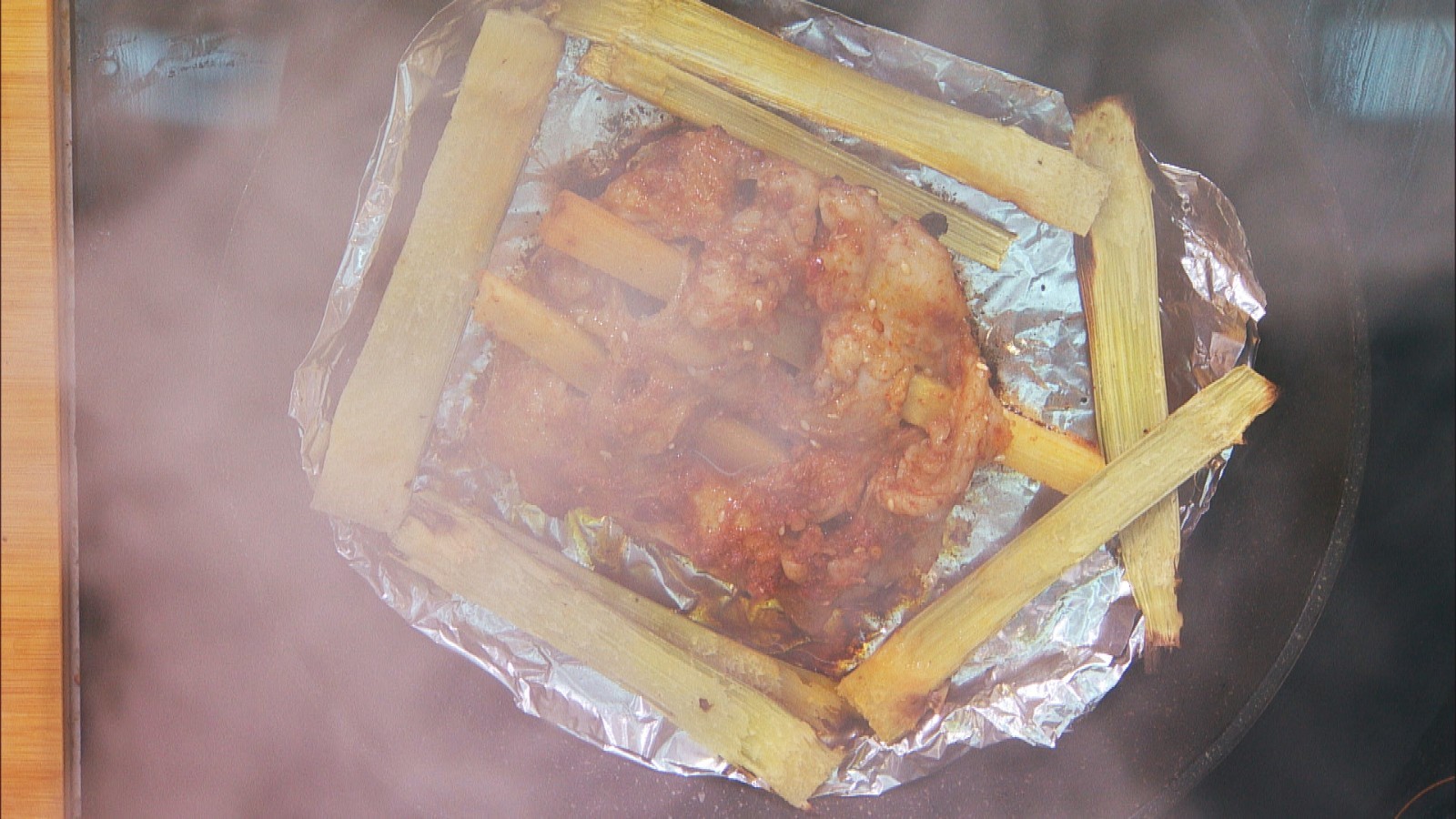 步骤2:锅中放锡纸,再放入羊肉,边上围上甘蔗皮,每面煎6分钟,再放入白糖、茶叶、甘蔗皮烟熏5分钟即可。