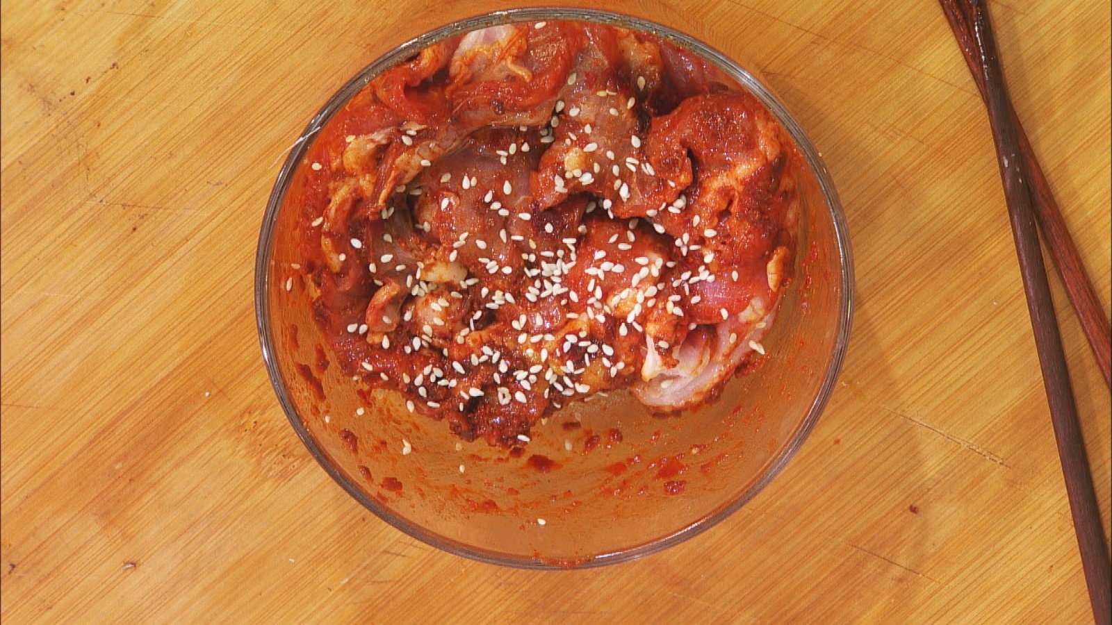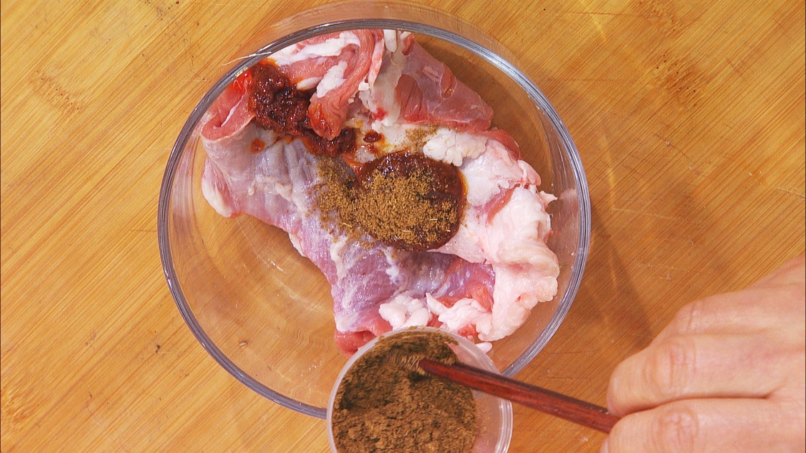 步骤1:羊腩肉改刀后用黄豆酱、孜然粉、辣椒面、芝麻腌制半小时,串上甘蔗条;