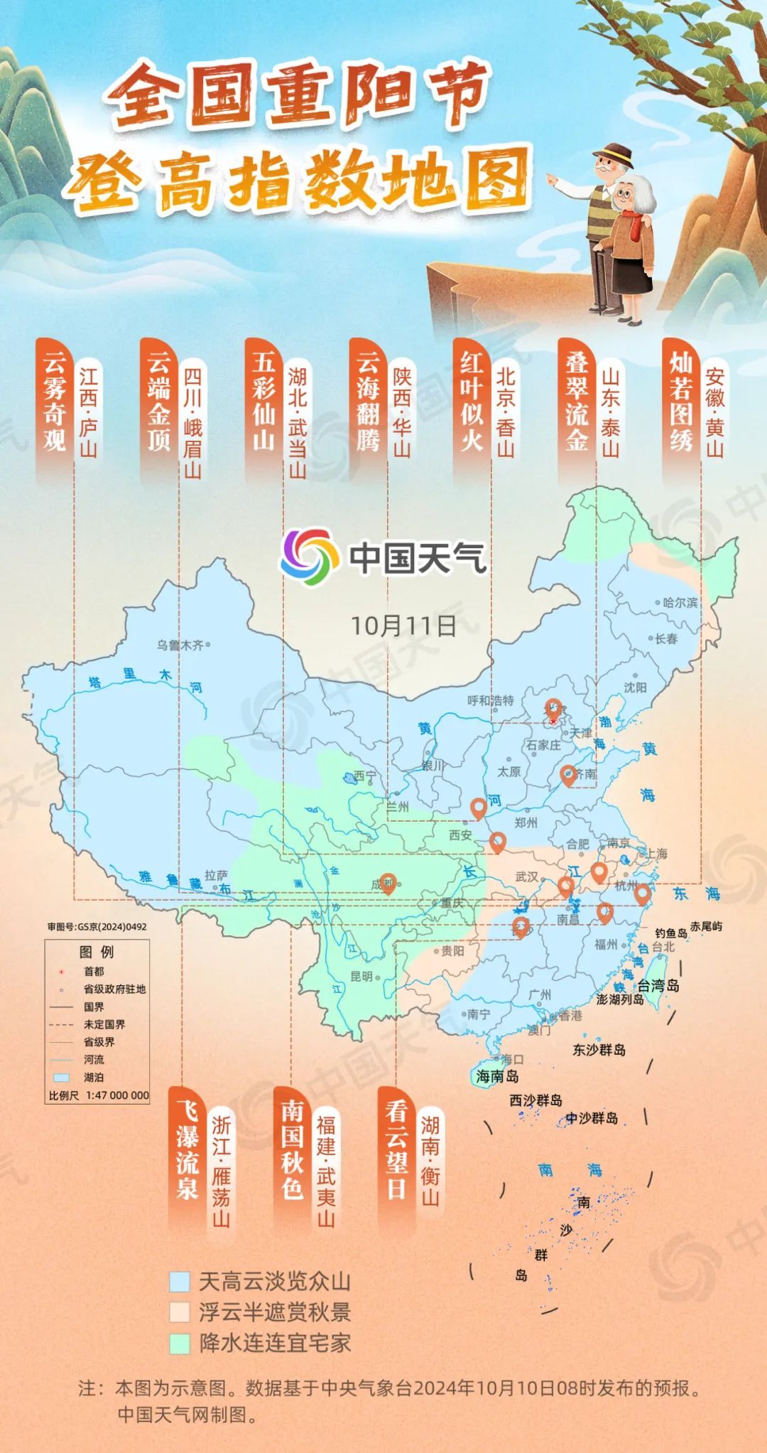 而在内蒙古东北部、黑龙江北部、青海大部、甘肃南部、陕西南部、西藏东部、四川、重庆、云南、贵州北部、海南岛大部和台湾岛大部等地,天公不作美,重阳节将遭遇阴雨天气。其中,近期雨水连连的西南地区在重阳节当天将开启新一轮降水过程,11日至14日,四川盆地、贵州、云南东部、湖南西北部等地部分地区有中到大雨、局地暴雨。上述地区需注意防范持续降雨和局地强降雨可能引发的次生灾害,不建议此时前往山区、河谷等高风险区域。