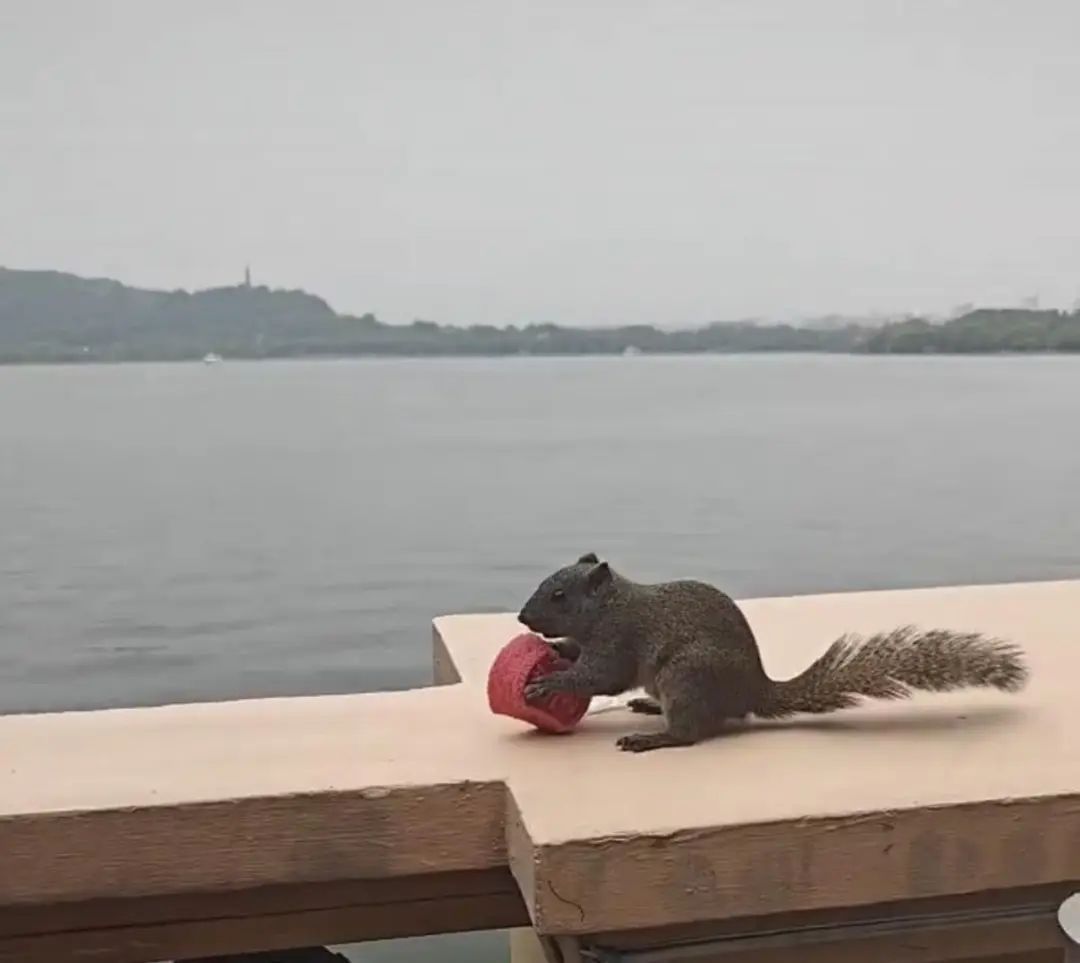 最近,杭州西湖边有一只“蹭吃”的小松鼠火了。它的走红源自一名网友在社交平台发布的短视频,视频中,小松鼠熟练跳上桌,叼走一块定胜糕,坐在护栏上享用。