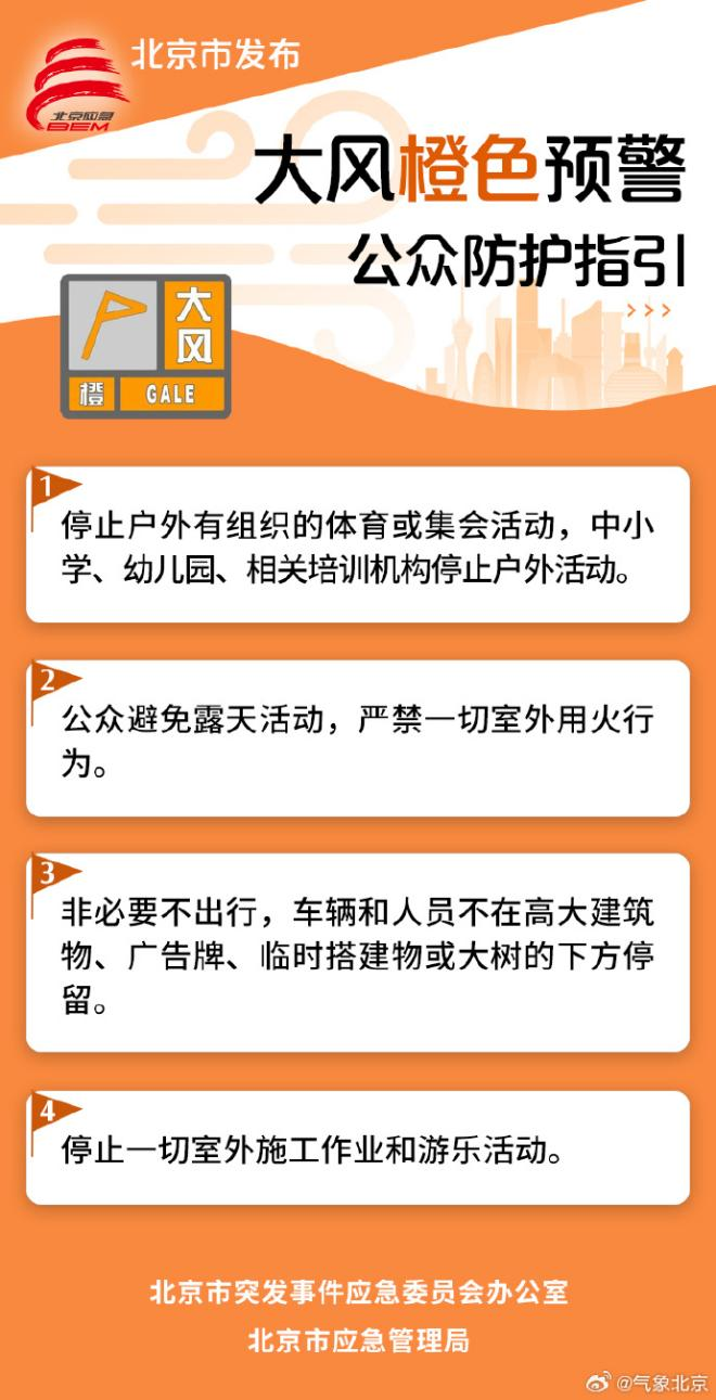 同日,北京市体育局、北京市体育总会发布关于做好大风天气应对工作的紧急通知,要求大风预警期间停止户外有组织的体育或集会活动,妥善处理好活动取消或延期后的相关事宜。